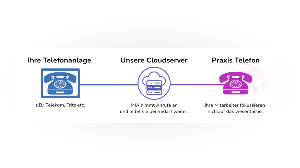 Die Einrichtung von MIA ist unkompliziert und in wenigen Minuten abgeschlossen. Ihre bestehende Telefonanlage leitet Anrufe einfach an MIA weiter, auf Wunsch zum Beispiel nach drei Klingelzeichen oder außerhalb der Sprechzeiten.